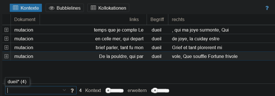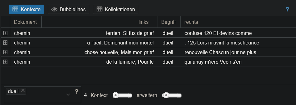 En utilisant l’outil Voyant et en téléversant environ les premiers 1 500 vers du Livre de la Mutacion de Fortune et environ les premiers 1 000 vers du Livre du Chemin de long estude, j’ai gagné une meilleure compréhension du contexte dans lequel le mot dueil lui-même a été utilisé, et l’analyse de contexte y est illustrée. Si l’on ne prend que le mot dueil, on ne constate pas d’usage singulier dans les deux textes, et le narrateur l’emploie de manière variée. Dans le Livre de la Mutacion de Fortune, le narrateur décrit le deuil de la mort de son mari comme une force qui la submerge et qui fait disparaître toute sa joie. Le deuil est également présent comme un deuil de la joie perdue, au degré où elle a perdu le bonheur qu’elle avait connu. La lyrique Christine dépeint son deuil comme une force si intense qu’il la faisait pleurer au point que Fortune en montra de la compassion. Le deuil ne représente pas seulement la perte mortelle, mais aussi la perte du chappel de sa mère, ainsi que les façons dont Fortune agit par son souffle aléatoire. Dans Le Livre du Chemin de Long Estude, le narrateur décrit le dueil comme quelque chose qui l’envahit et qu’il faut lourdement porter en tant que « mortel dueil », et également comme quelque chose qui se renouvelle chaque jour et la tourmente, jusqu’au moment où elle trouve sa consolation chez la philosophie.